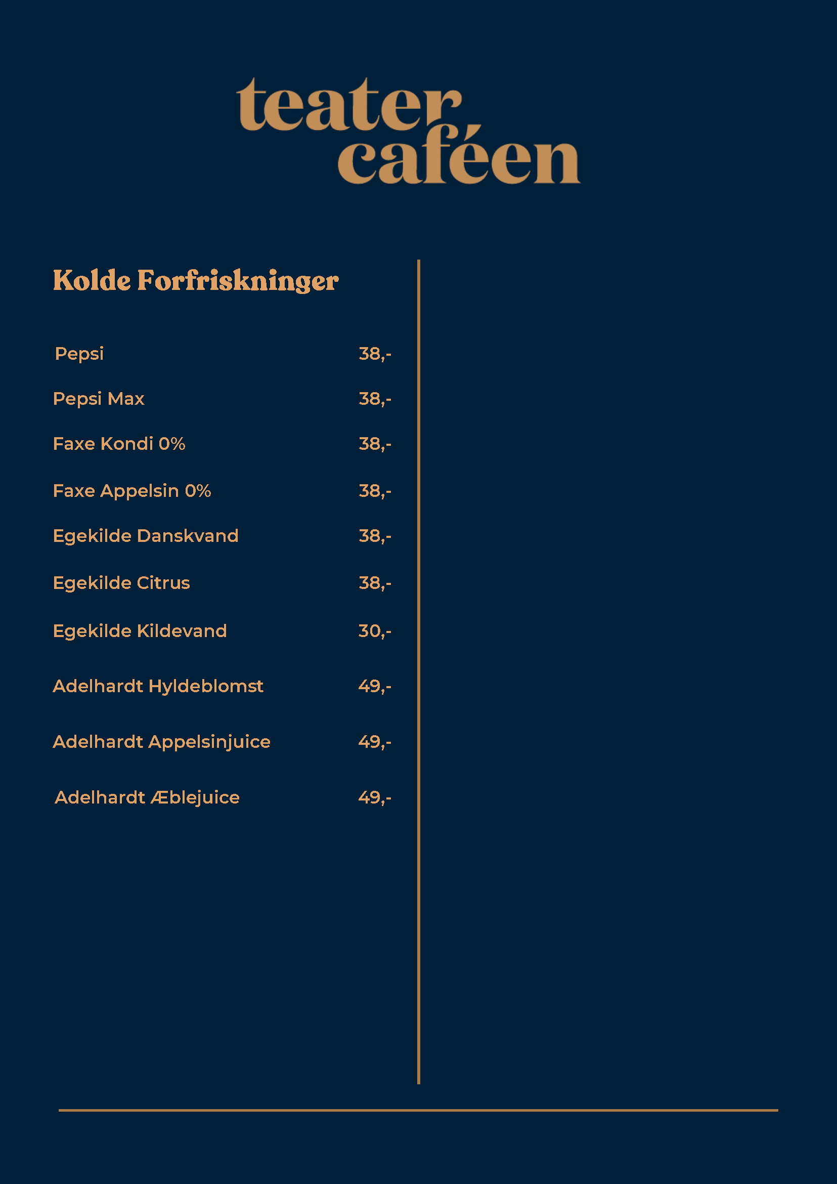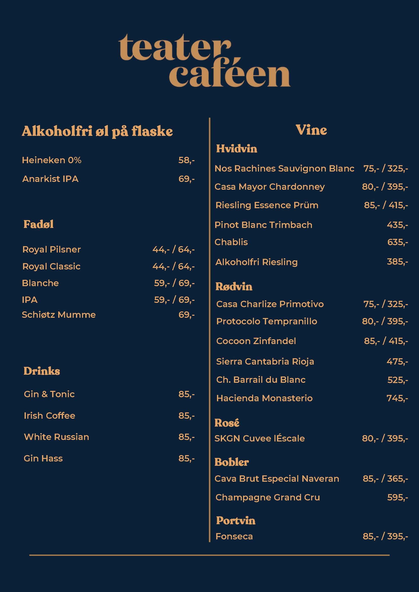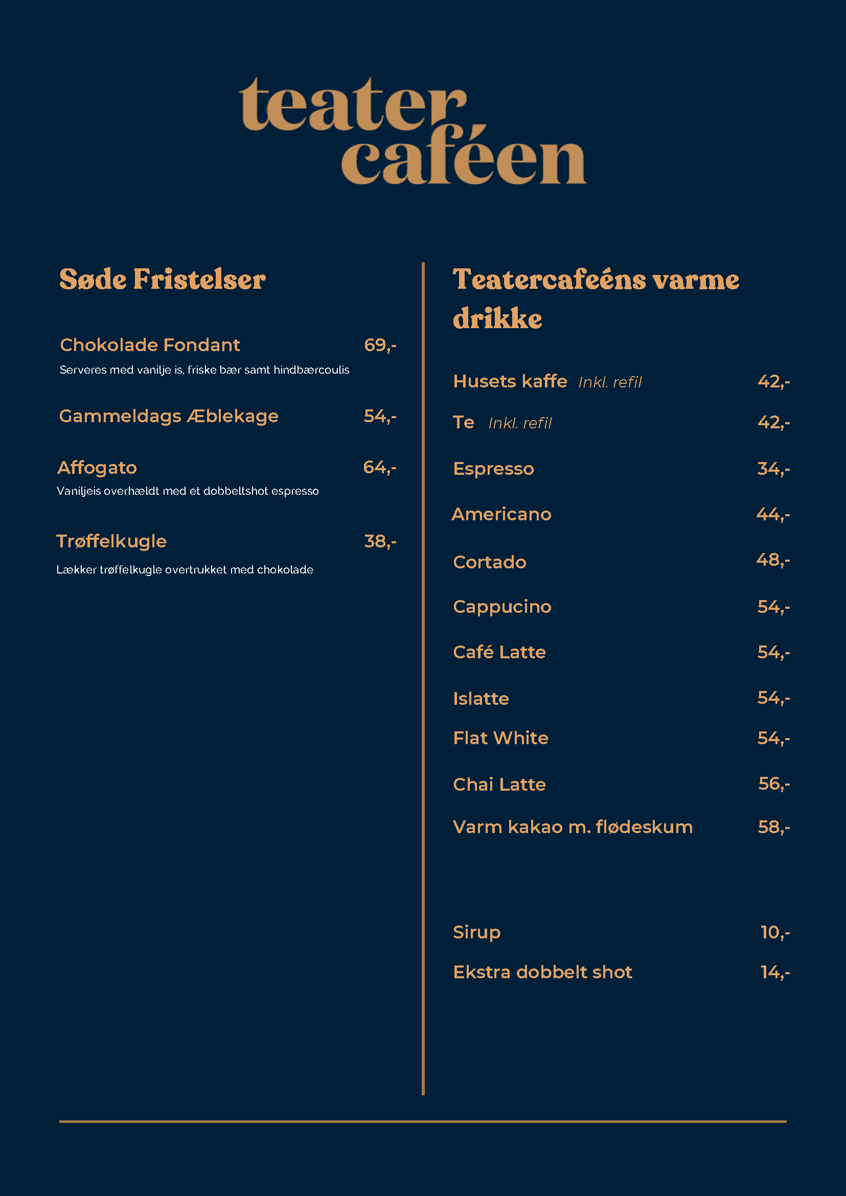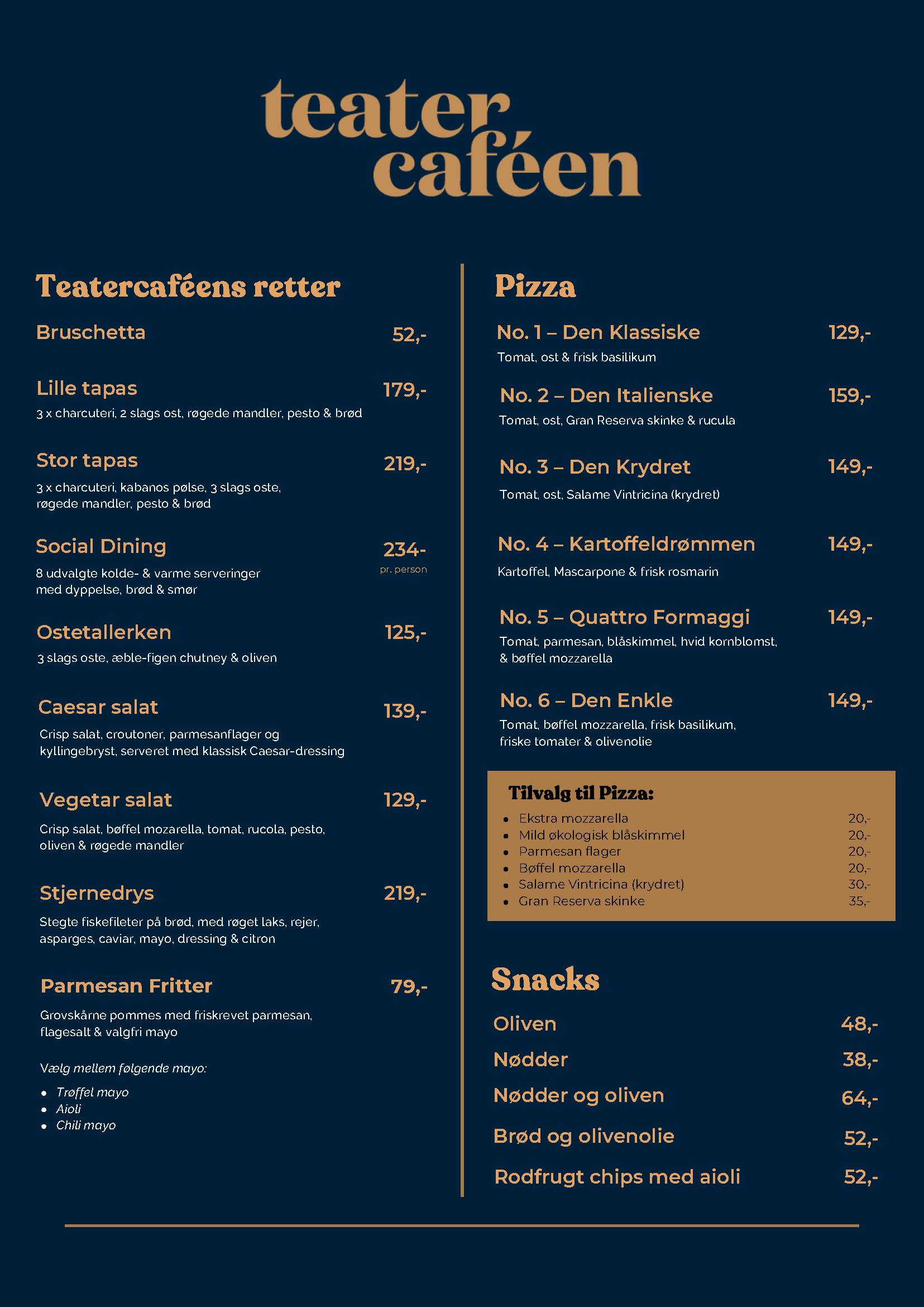 Teatercaféens menu byder på et varieret udvalg af snacks, tapas, salater og pizzaer lavet med friske råvarer og smagfulde kombinationer. Hertil kommer søde desserter og et bredt udvalg af varme drikke, kolde forfriskninger samt vin, øl og cocktails. Uanset om du er til en let anretning, en klassisk pizza eller et glas vin til forestillingen, finder du noget for enhver smag